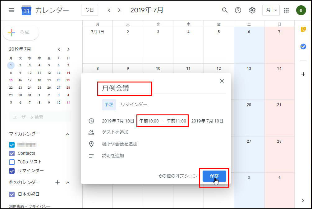 「その他のオプション」を押すと、より細かな設定ができる。あとから情報の追加や修正を行う場合は、カレンダー内の予定をクリックして画面上部のペンマーク(編集)を押すと開く。入力が終わったら最後に「保存」を押す。