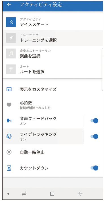 計測開始前に、ランニングやウオーキングなどの運動の種類や、目標とする距離なども設定しておける。画面はAndroid。