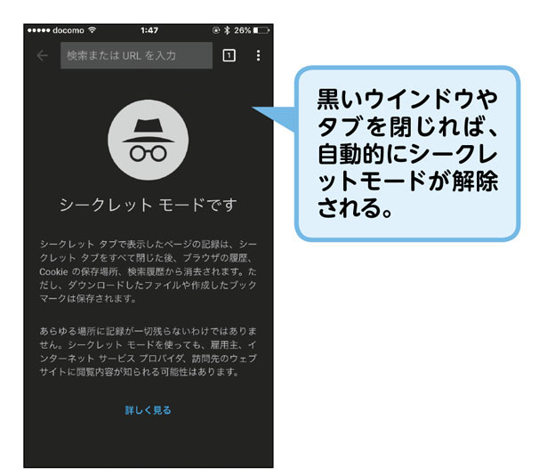 スマホ版の「Chrome」でも、シークレットモードを利用可能。黒い背景のタブならば、閲覧履歴などが残らない。