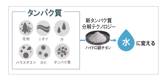 特殊セラミックの一種である「酸化銀チタン」を原材料とする「ハイドロ銀チタン」がタンパク質を分解。
