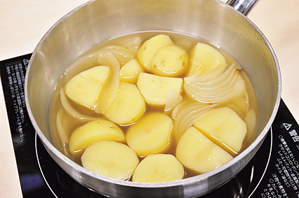 コンソメでゆでたジャガ&玉ねぎがスープに変身!