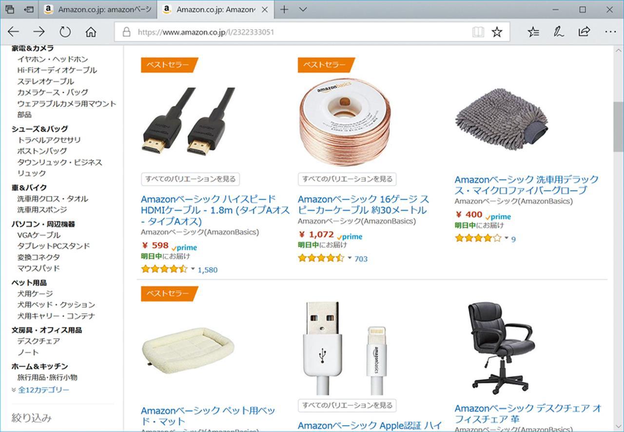 「Amazonベーシック」で商品検索すると、そのジャンル、数の豊富さがわかる。