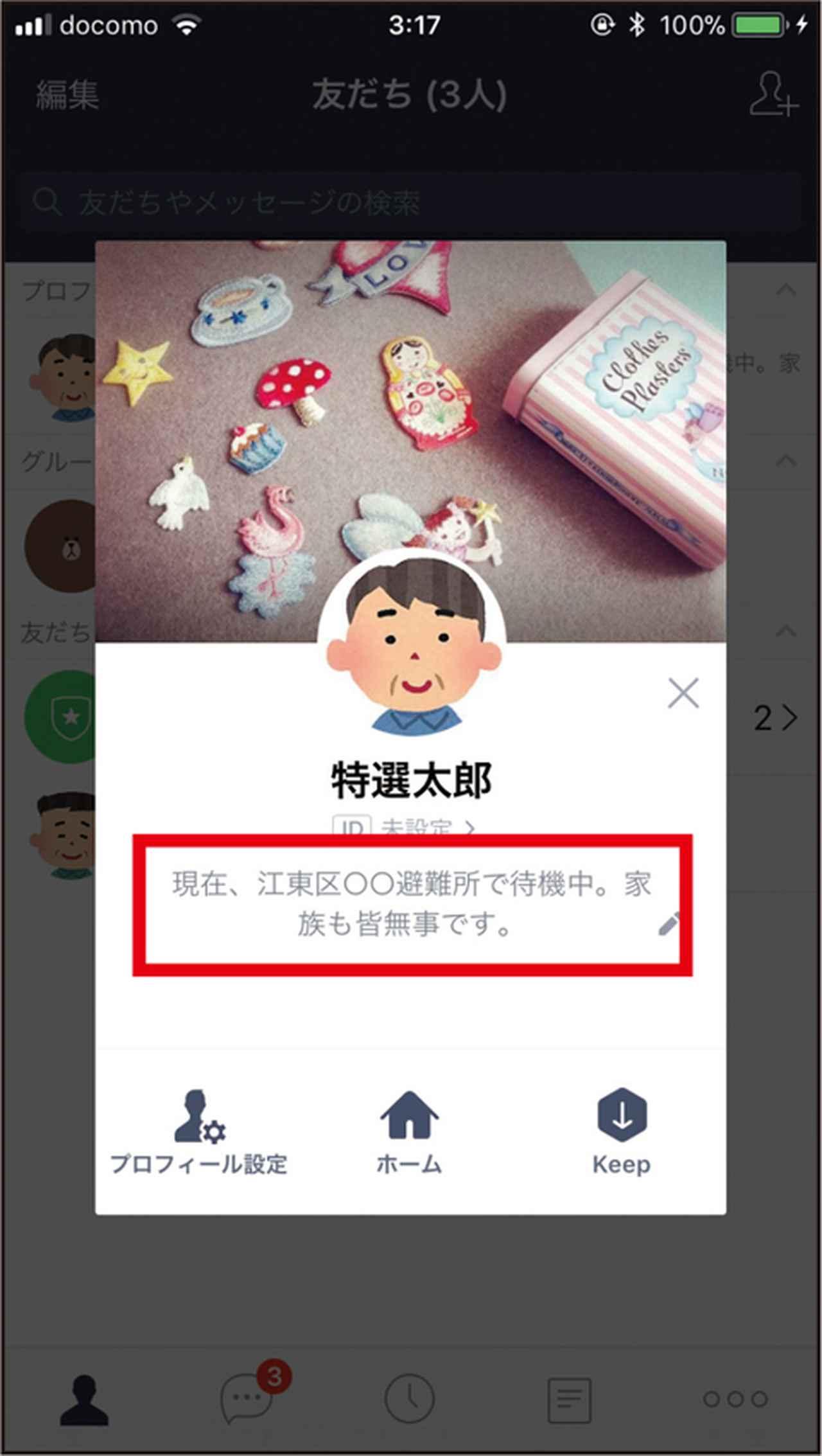 「ステータスメッセージ」に現状を記入しておけば、プロフィール画面だけで周囲に安否を伝えられる。