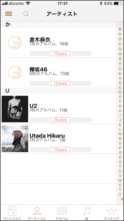 「CDレコ」の画面。iPhoneの「ミュージック」にある楽曲が表示される。