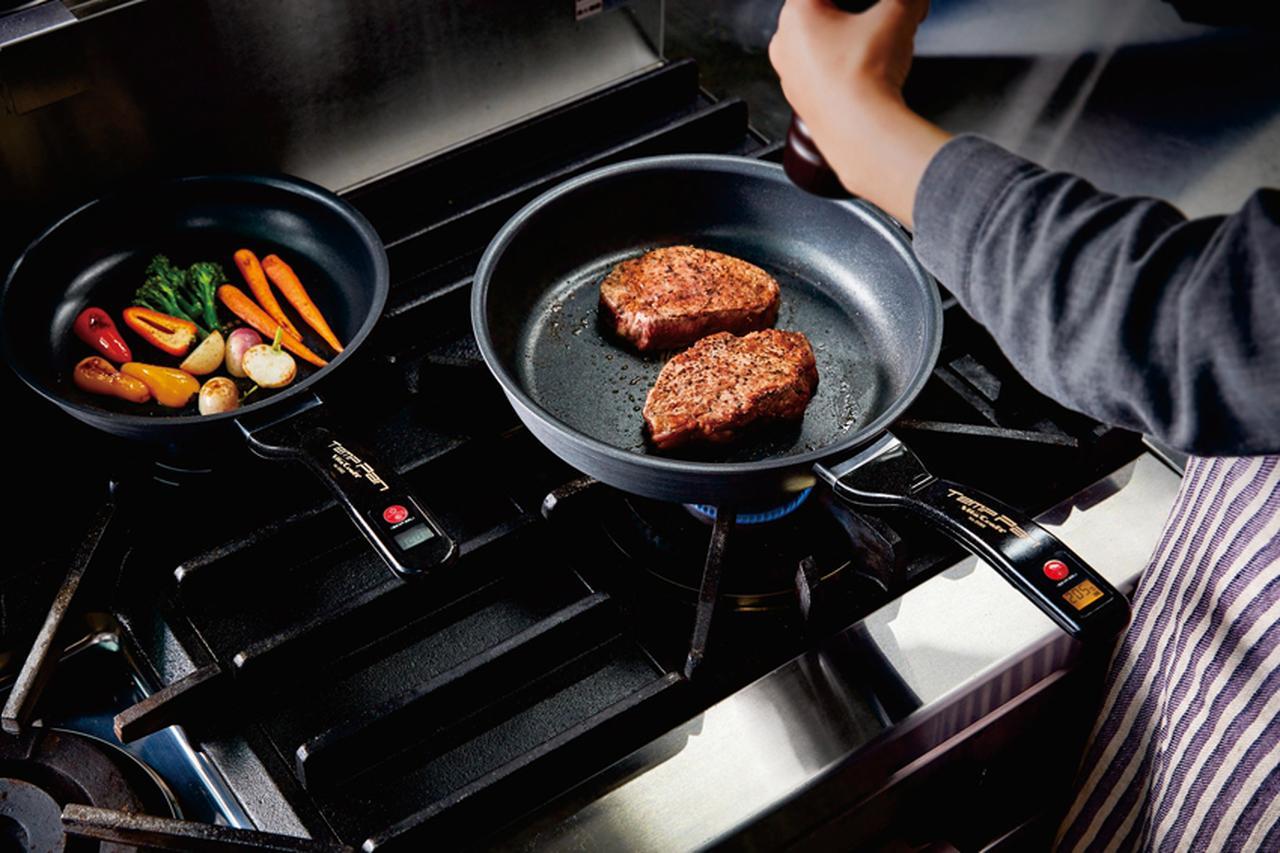 調理面に内蔵された温度センサーの計測値(1℃刻み)を、ハンドル部の液晶にリアルタイム表示するのが特徴で、温度を確認しながら的確に調理を進めることができる。
