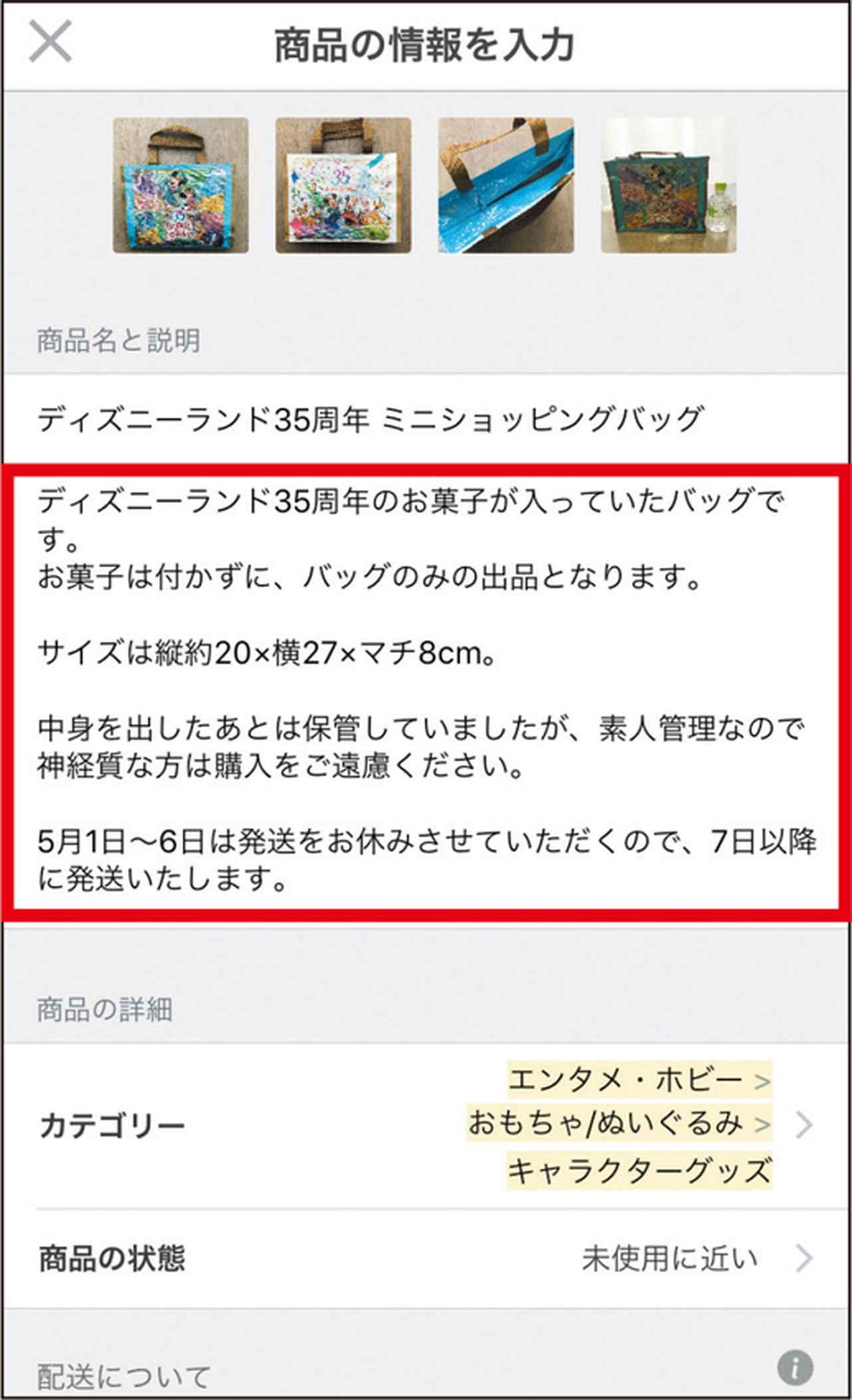 出品したアイテムの詳細情報をなるべくわかりやすく記入したら、カテゴリーや商品の状態も入力する。
