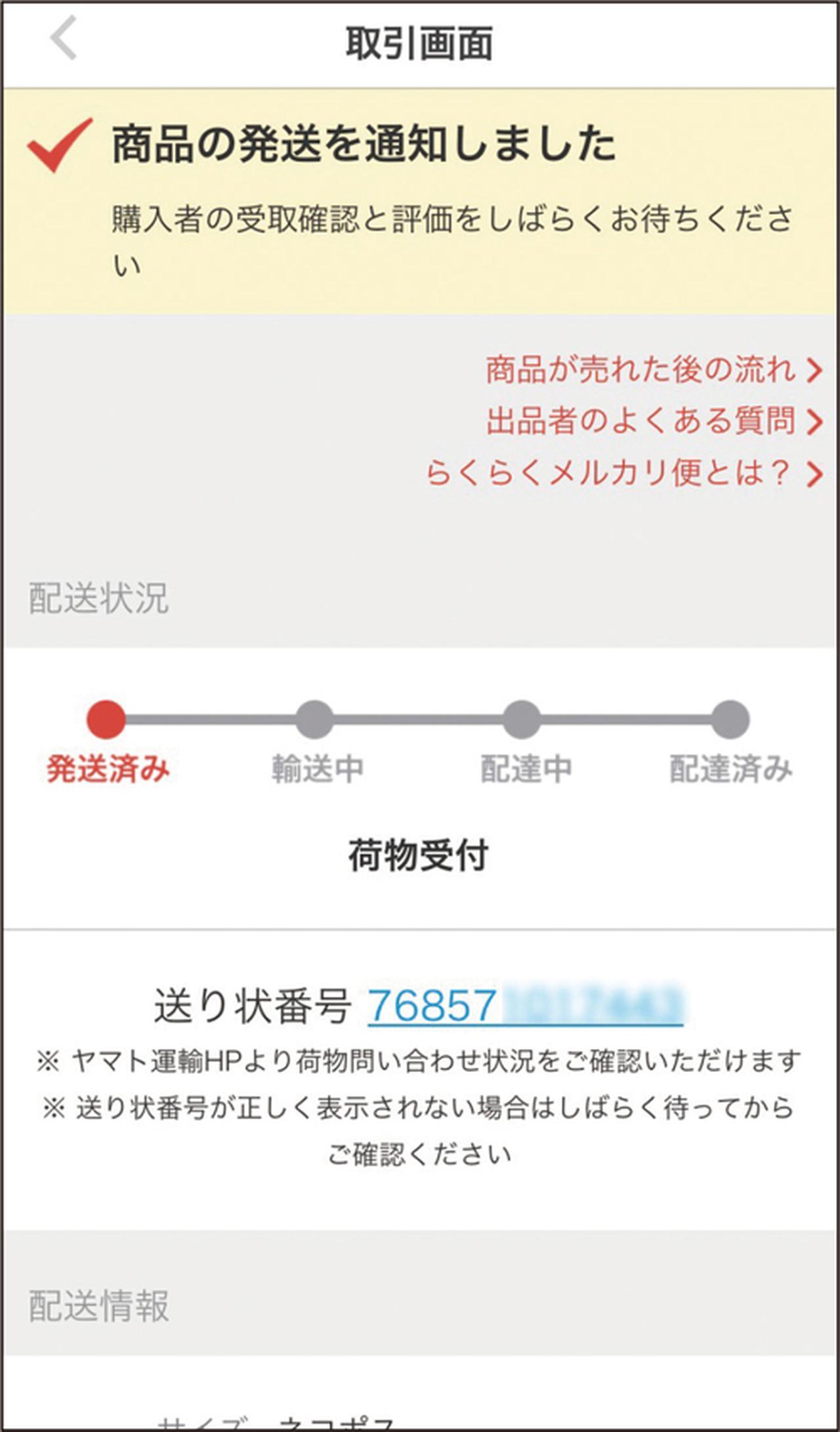 商品を発送すると、購入者にも通知が届く。あとは、相手が受け取ってくれるのを待つだけだ。
