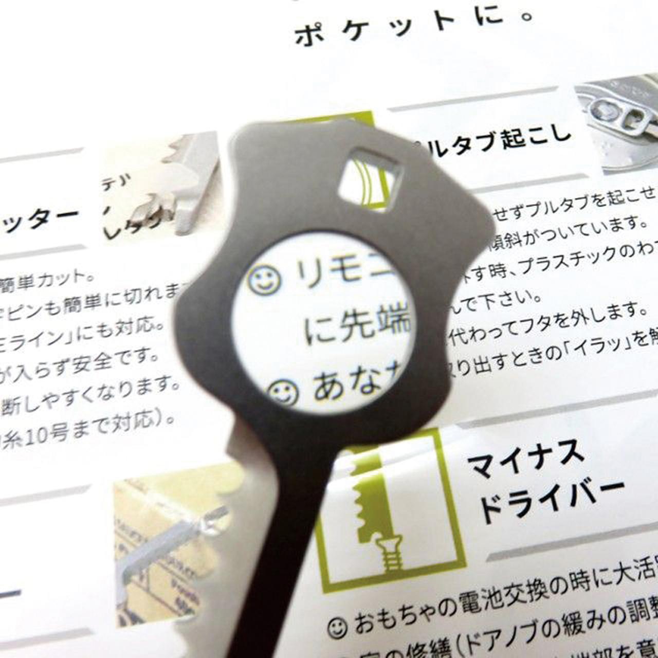 シニアが重宝するルーペ、糸切り、磁石、カートンオープナー(段ボールなどの箱開け)、プルタブ起こし、マイナスドライバーという六つの機能を装備している。