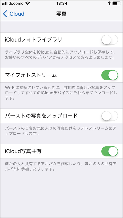 「アカウントとパスワード」→「iCloud」→「写真」で「マイフォトストリーム」などを設定できる。