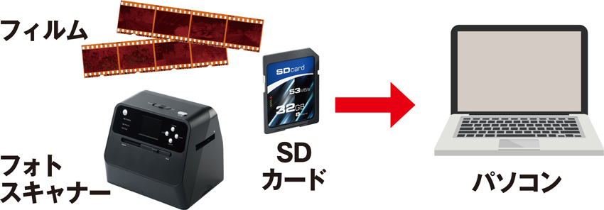 フィルムは面積が小さく、プリント写真と比べて、粗い画像になりがちだが、プリント写真の傷みや退色が激しい場合は、フィルムからの取り込みも、有力な選択肢の一つとなる。まず、本機でSDカードに保存し、そのあと、パソコンに転送して保存することが可能。パソコンに保存しておけば、あとから画像をさまざまに活用できるようになる。