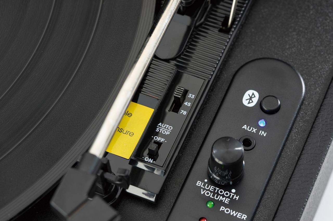 3スピード対応で、既存のオーディオシステムに接続する音声出力端子(RCA端子)を装備しているだけでなく、ブルートゥースの送信機能とブルートゥース専用の音量調整ボリュームまで搭載しているので、手持ちのブルートゥーススピーカーでレコードを聴くこともできる。