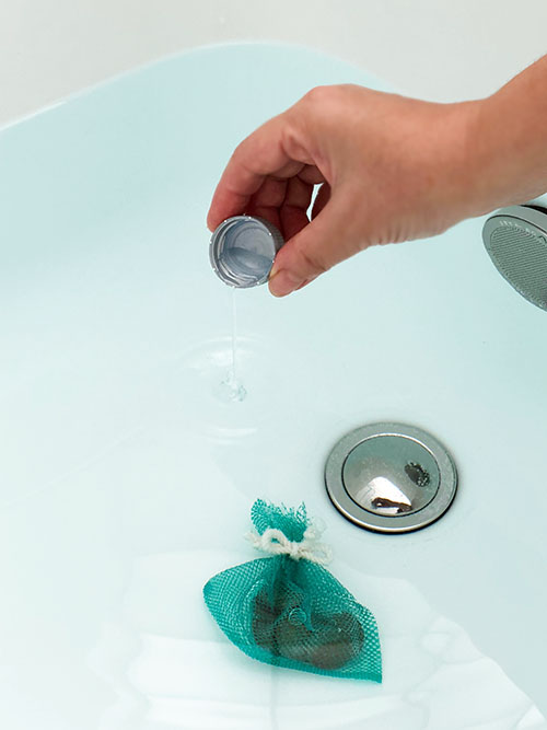 ミョウバン銅貨浴は、至って簡単です。オクラなどを売る際に入っているくらいの網袋に、10円硬貨を20枚以上入れ、浴槽に入れておきます。そこへ、ミョウバン原液を、ペットボトルのキャップ5杯ほど入れるだけです。