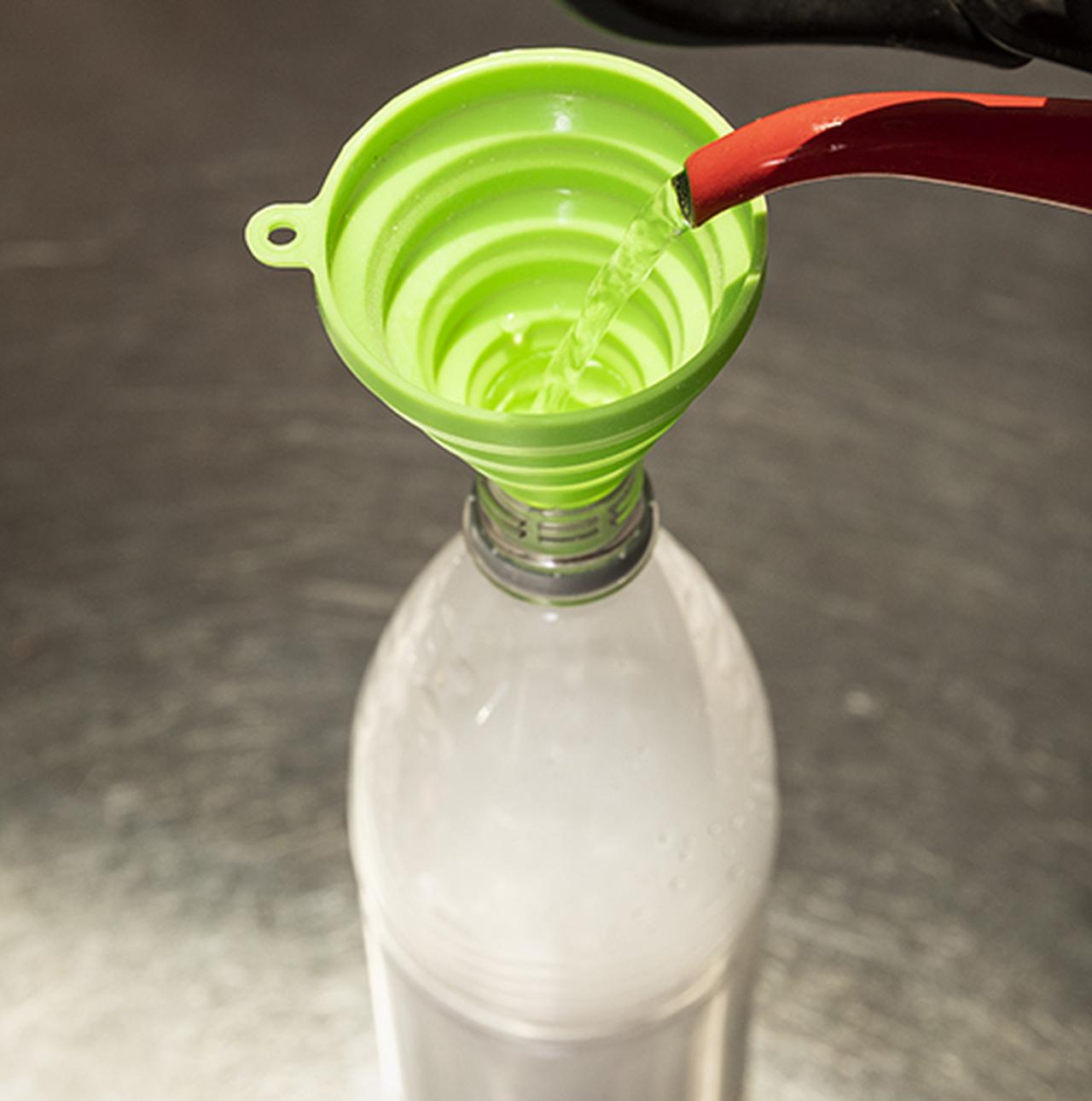 そして、空になったペットボトルに漏斗などを使ってミョウバン50g(1袋30gならば2袋)を入れ、そこにやかんのお湯をすべて注ぎ入れます。