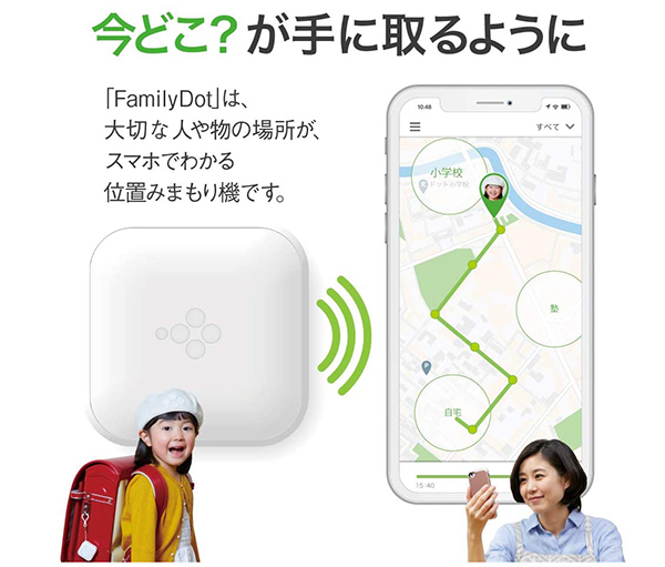 GPS端末のボタンを押すことで、現在位置をスマホに送信できる『一方向タイプ』である。位置情報の取得は、GPS、準天頂衛星システム「みちびき」、携帯電話の基地局電波、Wi-Fi局の電波など、複数の情報を利用しており、従来の他社製品より高精度となっている。本体は約5センチ角で、他社の子供用GPS端末とほぼ同じ大きさだが、多機能である。
