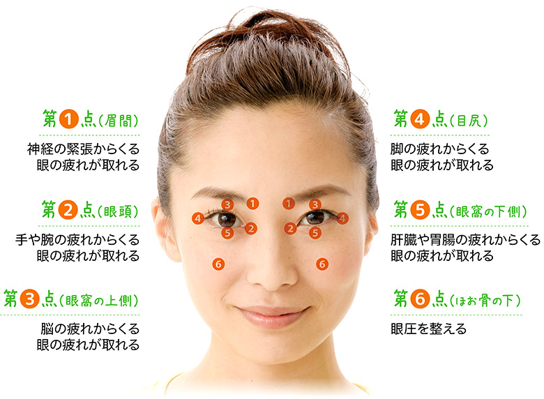 私たちは神経を集中させて何かを見ようとするとき、眉間に力が入って縦ジワが寄りがちですが、こうした過緊張した眼の疲れには、第1点がお勧めです。