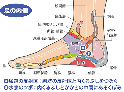 土踏まず(かかと寄り)から内くるぶしの後ろ側にかけてある尿道の反射区を親指の腹でしごく。膀胱の反射区である土踏まずからアキレス腱に向かって、老廃物を押し出すように親指に圧をかけてすべらせる。2~3回くり返す。