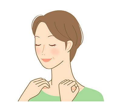 顔のたるみが気になる年代。マッサージで老廃物を流すことが重要。角質ケアをしたら、リンパの流れを意識して、額、側頭筋、こめかみ、眉の上、鼻の横、頬の下、耳の下、フェイスラインからデコルテ、鎖骨、というようにマッサージをしていく。