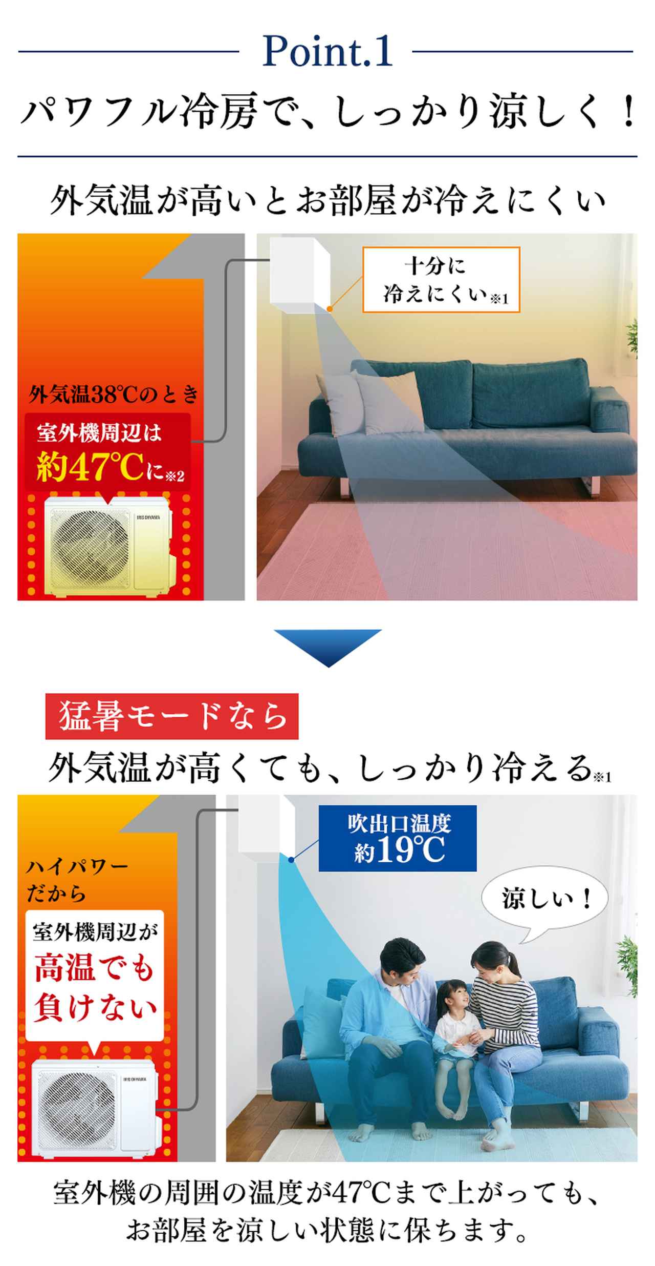 今回のアイリスオーヤマは、あえて室外機を「大きく」設計。猛暑時の冷えをとことん追求しました。外気温が38℃で、室外機が47℃の時でも、確実に冷えるように設計されています。