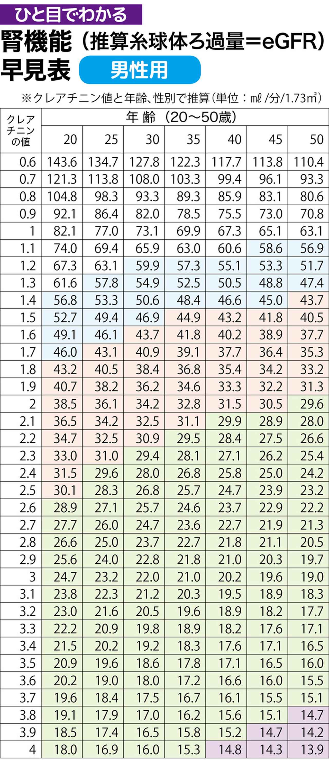 ※日本腎臓学会の「eGFR男女・年齢別早見表」を参考に作成。