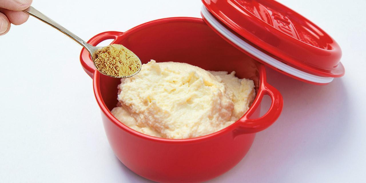 ヨーグルトにはホエー(乳清)という水分が含まれており、おからパウダーがそれを吸って、生おからの状態に戻ります。水で戻すよりコクがあるうえ、栄養価が高いのが、おからヨーグルトの特長です。