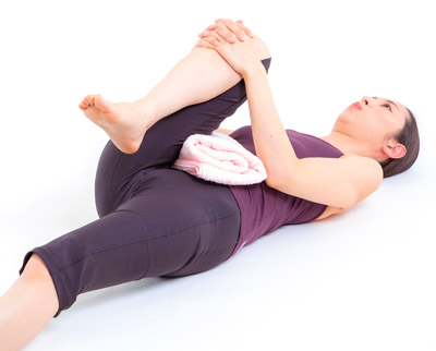 足を抱えたときに、太ももがおなかに付いて、腸を刺激します。足がおなかに付かない場合は、足のつけ根の上に丸めたタオルを挟むとよいでしょう。