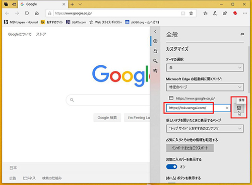 すぐ下の「URLを入力してください」と書かれた枠にGoogleのURLを貼り付ける。枠を右クリックして「貼り付け」を選ぶか、キーボードで「Ctrl」+「V」を押せばいい。そして、右側のフロッピーマークをクリックして設定を保存する。