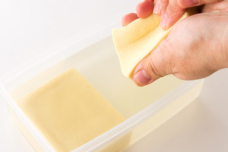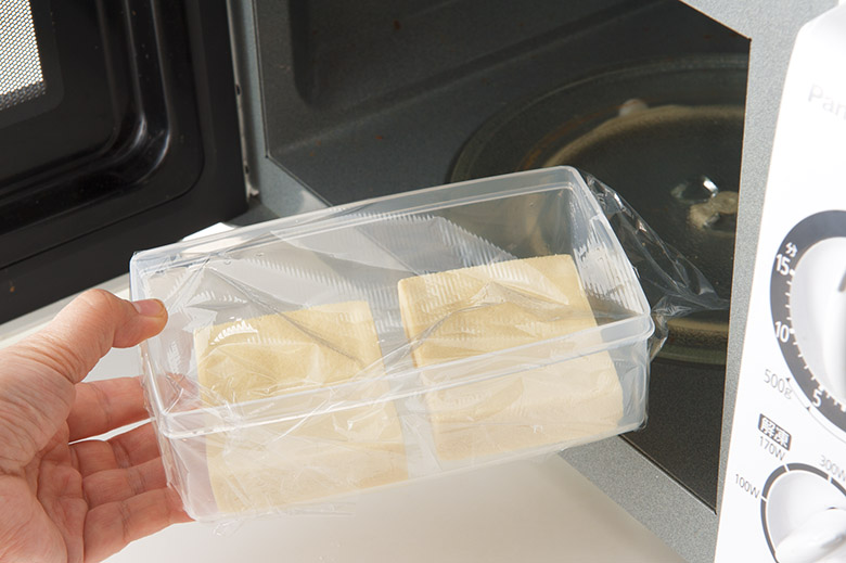 ❶高野豆腐は水(分量外)に2分ほど浸して戻し、水気を絞る。