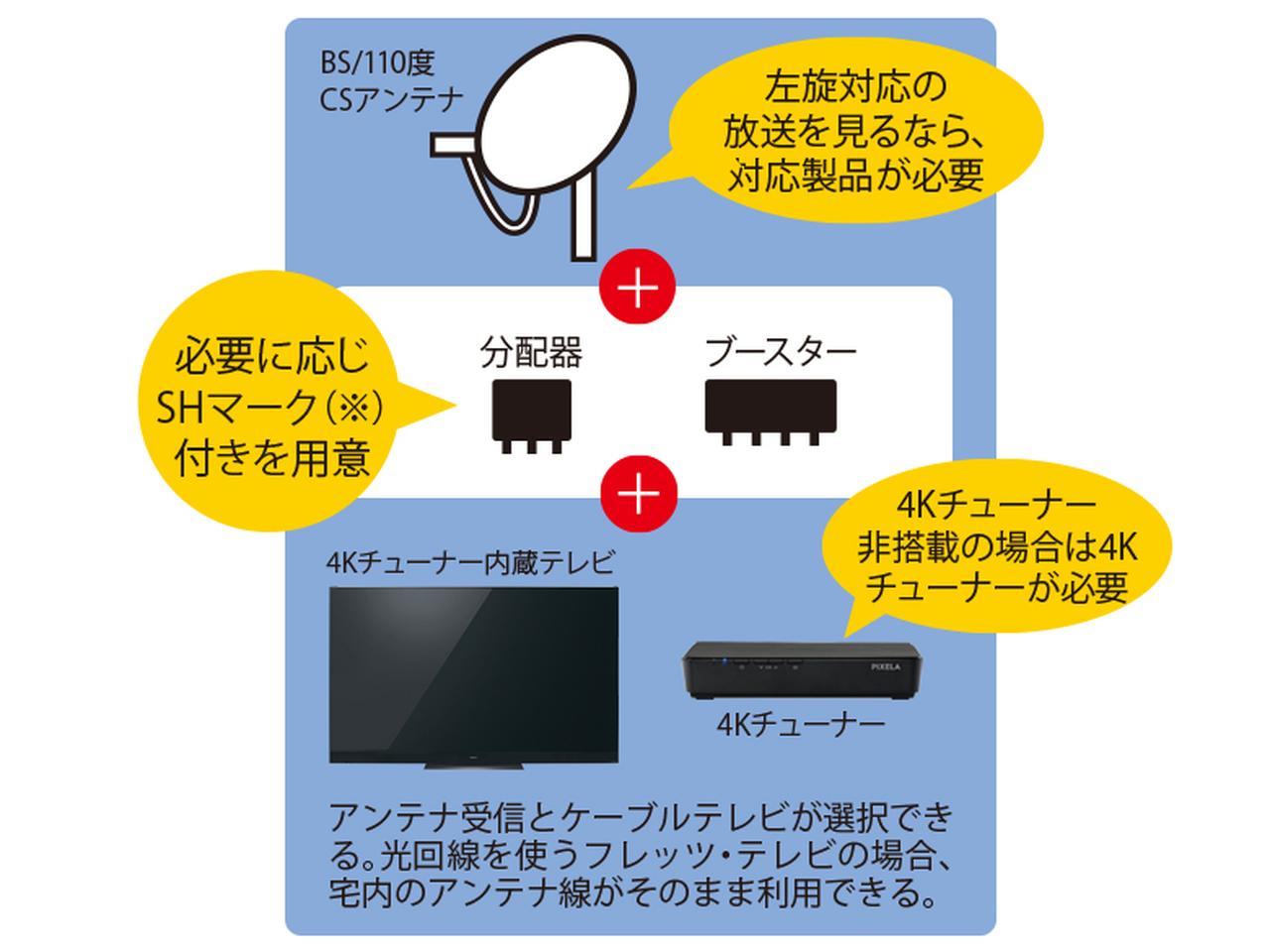 BS衛星による4K放送を受信するなら、原則パラボラアンテナが必要。4K放送の主要局は「右旋」という電波を利用しており、既存のBSアンテナや配線設備がそのまま利用でき、4Kチューナーを加えるか、同チューナー内蔵テレビを用意すればいい。