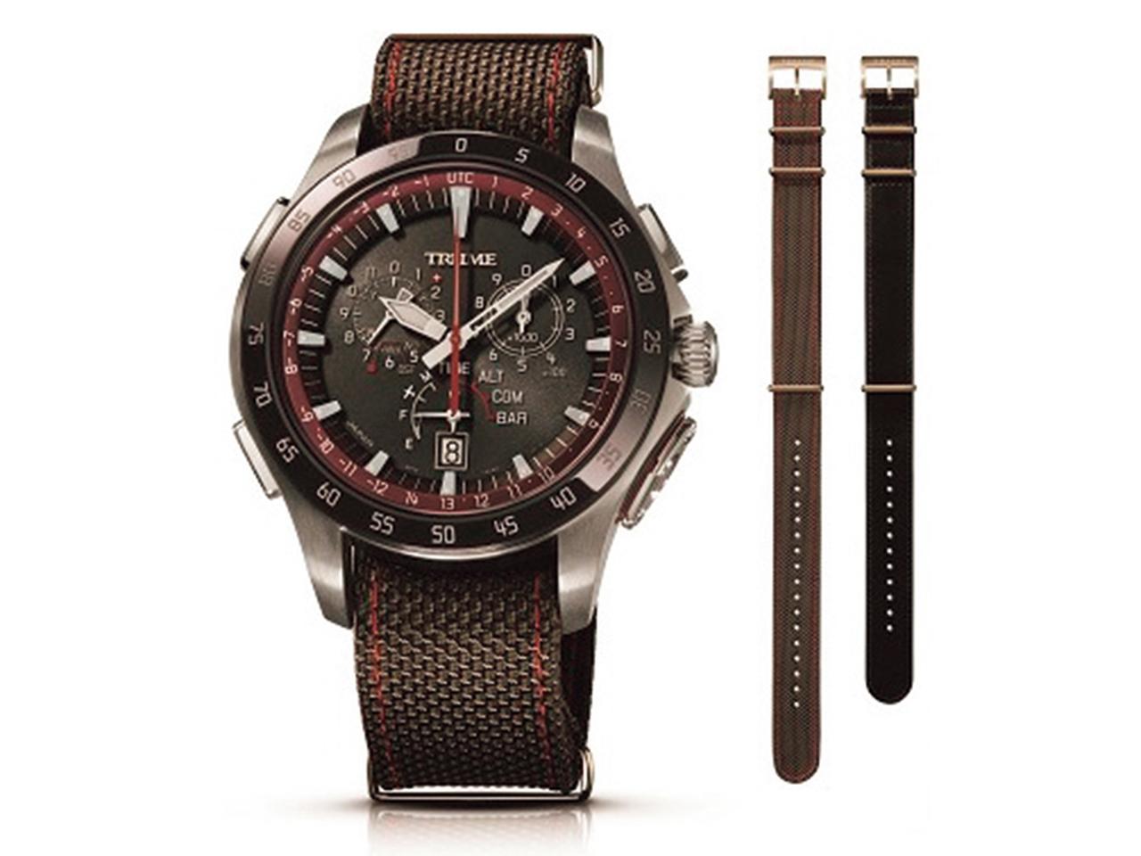 基本仕様は両モデル共通で、ケース素材はチタン。文字板やベゼルのアラビア数字には、オリジナル書体を採用している。標準のナイロンバンドのほかに、レザーバンドも付属。