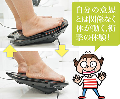 電気が筋肉に直接作用。つま先が勝手に伸びて、ボードを前に倒しちゃう!