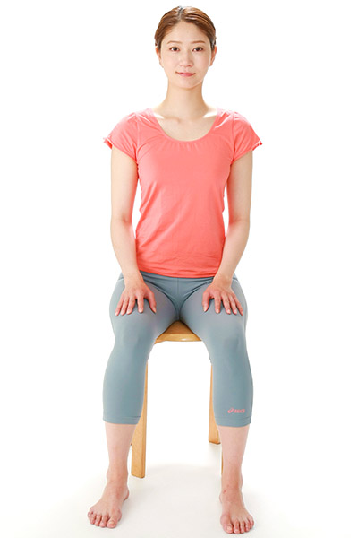 ❶上半身はまっすぐ、足は肩幅に開く。立っても座ってもよい。