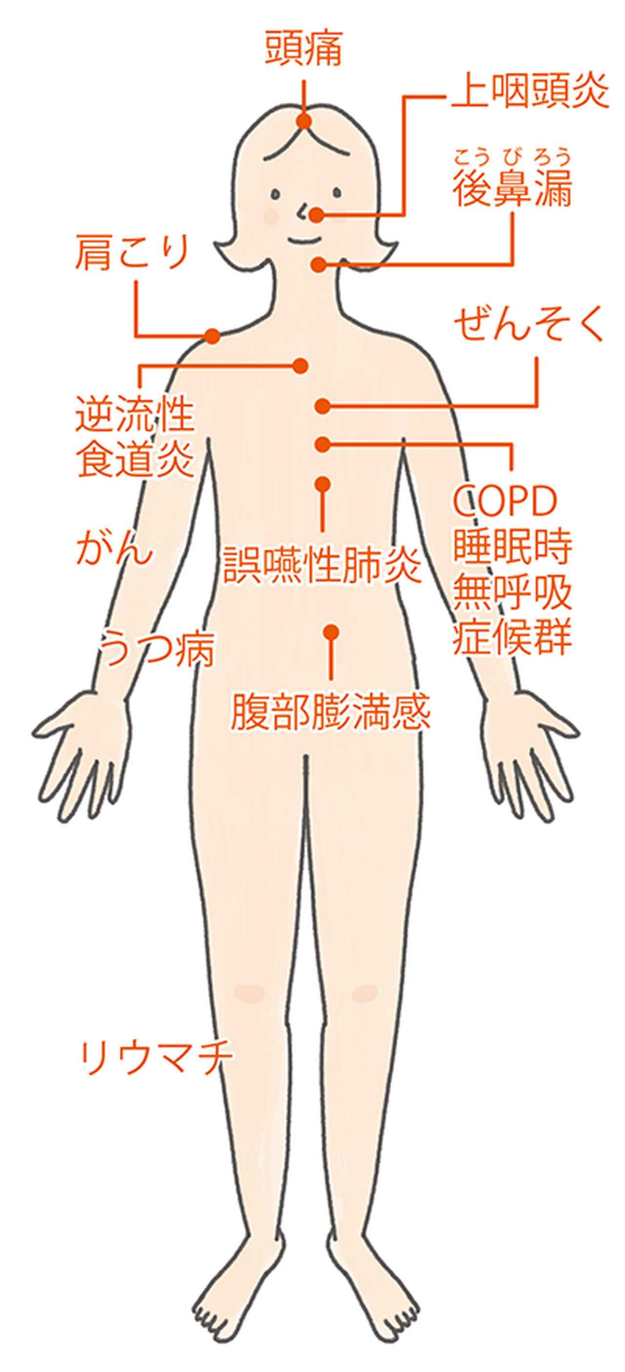 やがて、呼吸困難、気管支喘息やCOPD、誤嚥性肺炎といった、さまざまな病気につながることがあります。