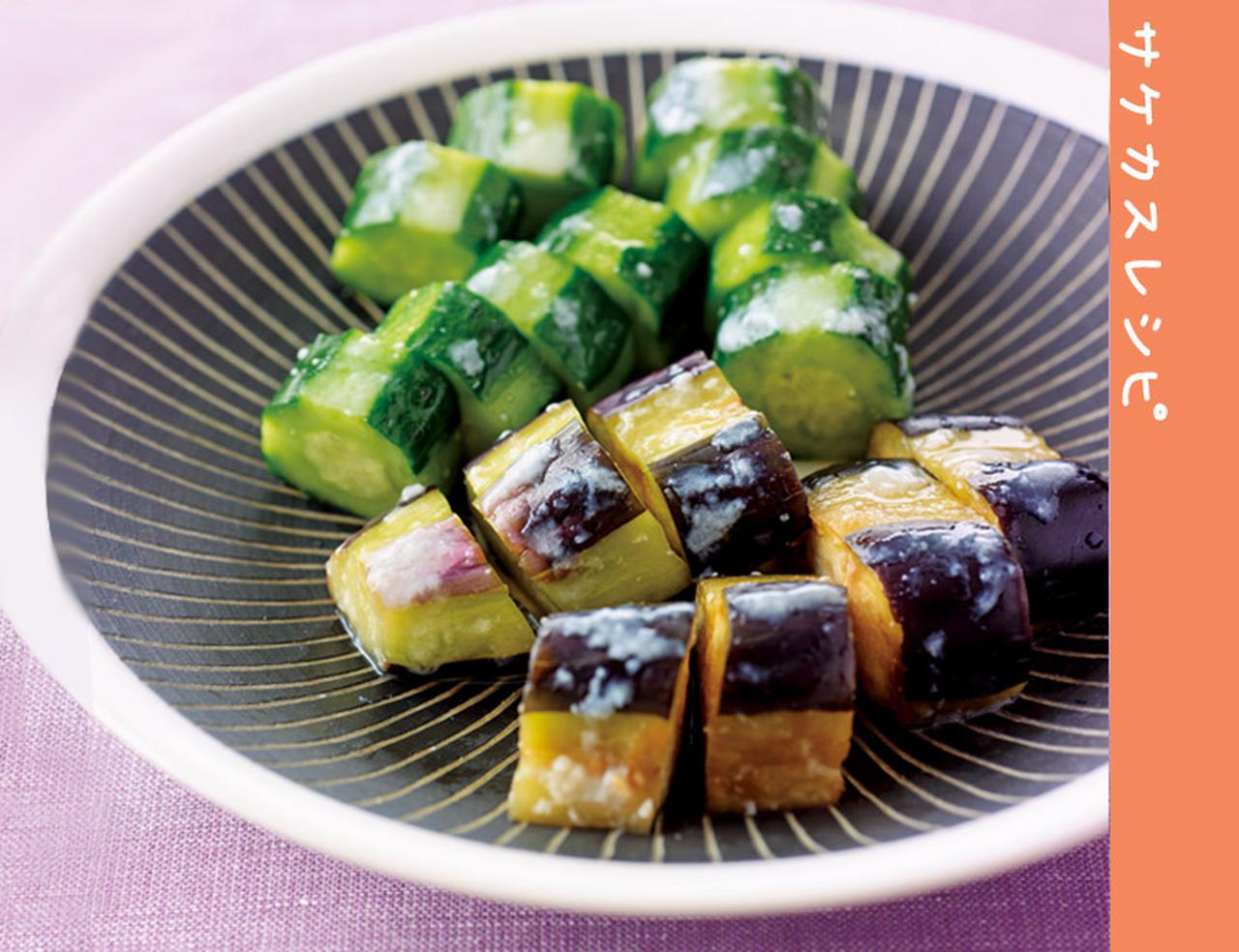 ❷冷蔵庫に入れて、1時間漬けたら完成。酒かすペーストを軽く落とし、半分に切って器に盛り、大葉を添える。