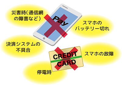 スマホはバッテリーで動作するため、残量がある限りは利用できるが、お店が停電して、レジや決済端末が利用できないケースも考えられる。