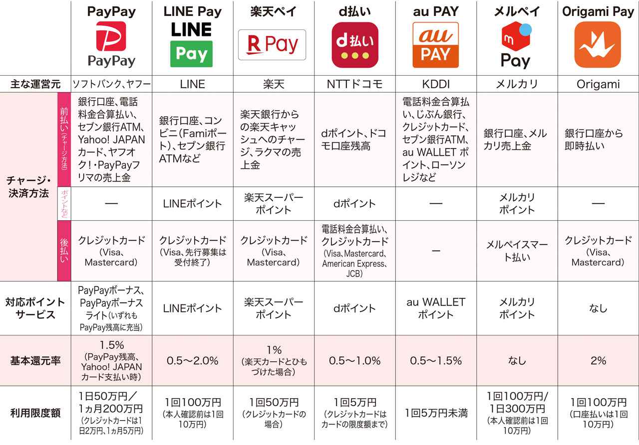 中でも、下記の表にある七つは、広く利用されている。このほか銀行系や物販イベントなどで利用されるもの、コンビニ独自のサービスもある。