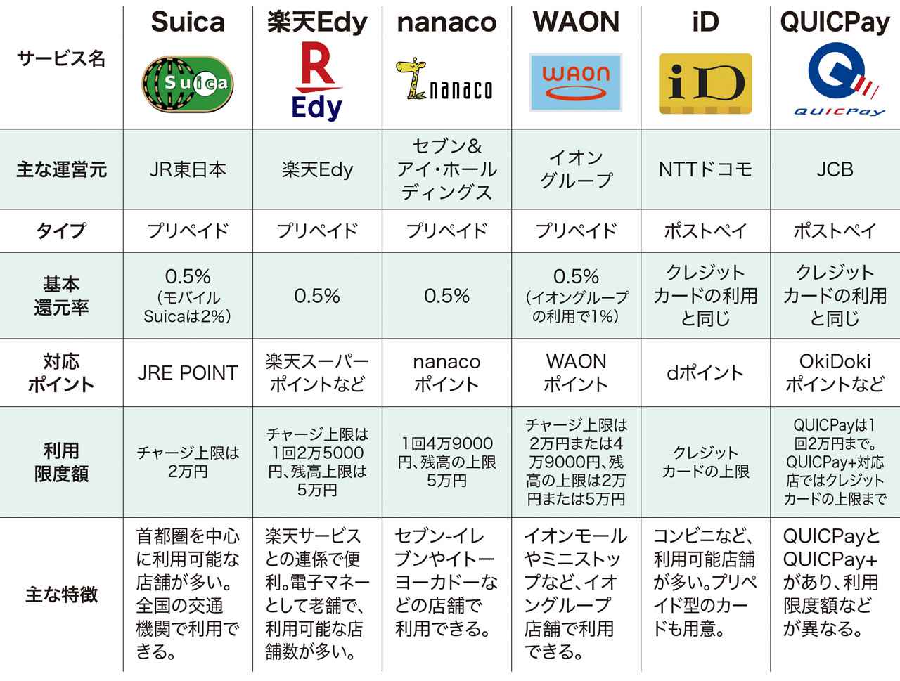 プリペイド型ではSuica、楽天Edy、nanaco、WAON、ポストペイ型ではiDとQUICPayが代表的。