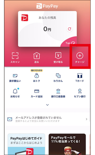 PayPayの場合、アプリのホーム画面で「チャージ」をタップすれは、チャージ画面に移行する。