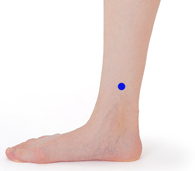 左右の足にある。内くるぶしの頂点から、アキレス腱の際に沿って、手の指の横幅3本分、ひざのほうへ上がったところ(写真は右足)。左右のうち、押してみて痛みの強いほうを1日1回、就寝前に10回押す。