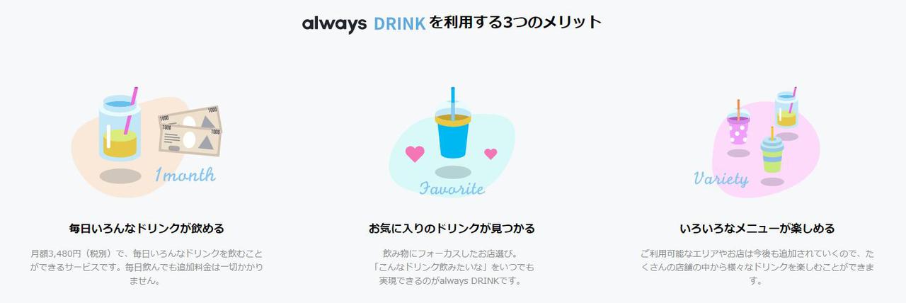 「always DRINK」とは、定額料金でドリンクが楽しめるサブスクリプション(定額制)サービス。毎月一定の金額を支払うことで、提携店舗が用意した各ドリンクが無料になります。