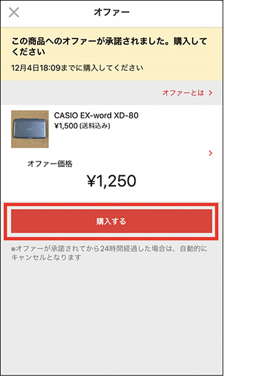 相手がオファーを承認すると、交渉した価格での購入が可能。支払い方法や配送先を確認して、「購入する」をタップ。