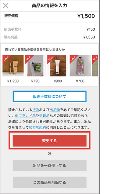 商品情報の修正は、「マイページ」→「出品した商品」で商品を表示。「商品の編集」をタップして編集する。出品の一時停止もできる。
