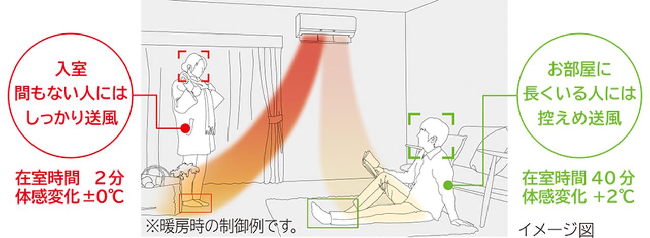 人の識別機能では、頭部や顔部、胸部の色など、複数の特徴から個人を見分け、在室時間を把握。体感温度を予測して、風を送ったり止めたりの調節を行っている。