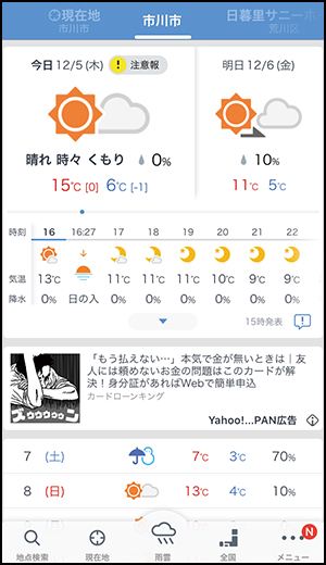 地域登録して、1週間天気と1時間天気がわかるアプリ。iPhoneのウィジェットにも対応している。