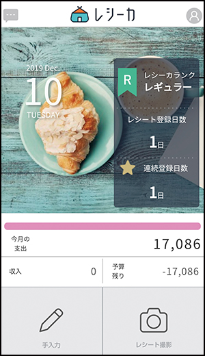 レシートを撮影すると、自動的に品名や金額が読み取られ、記録される。手入力も可能。