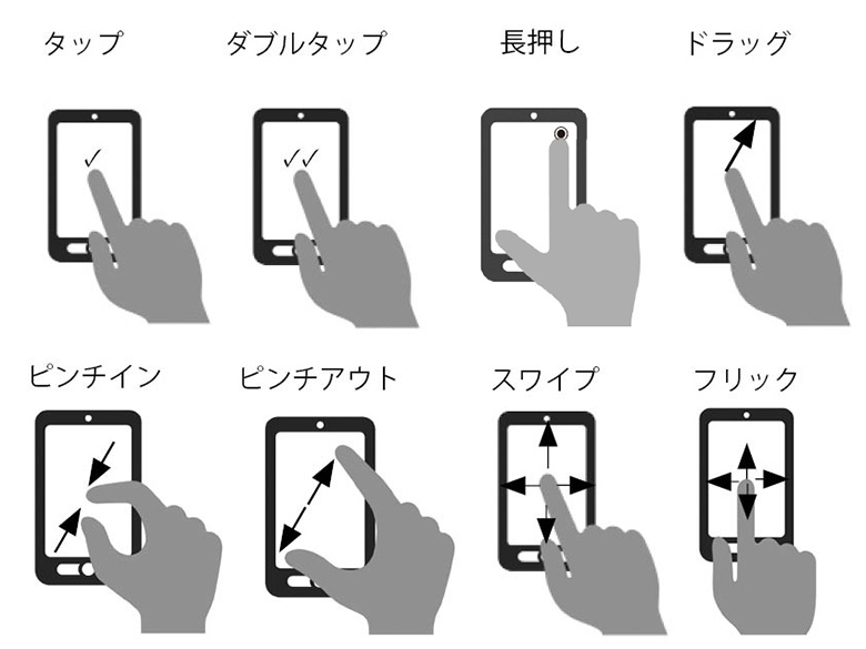「フリック」・・・文字入力時などに画面を指でなぞる操作