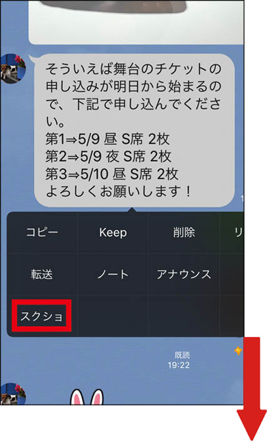 トークルームでのやり取りの一部を残しておく「スクショ」(スクリーンショット)機能がある。必要なメッセージを画像として保存できるのだ。保存したいトークを長押しして、操作メニューから「スクショ」を選択。保存するトークを決めたら、「スクショ」をタップする。