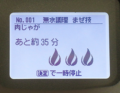 無水調理をメインとし、今回の機種の中で唯一、圧力調理を行わない。角煮などは圧力調理に比べると時間がかかるが、メニューによっては、減圧時間がかからないぶん、本機のほうが早い場合もある。料理の出来上がる時間が明確なのも利点だ。