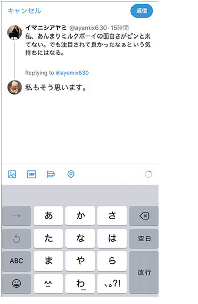 ツイートの左下の吹き出しのアイコンをタップすると、リプライ(返信)の入力欄が表示される。