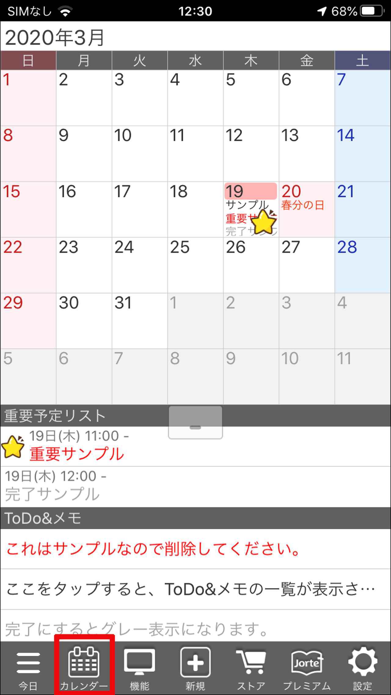 アカウントの準備ができたら、ジョルテのメイン画面下部の「カレンダー」をタップ。