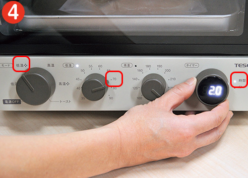 ❹「モード:低温」→「温度:低温70)」→「タイマー:2.0時間」の順番にセット。